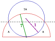 Suspeito que algum tipo de cálculo (e não somente um argumento desenhado) seja aqui inevitável. Estou ciente disso que constatações desse gênero são bastante arriscadas, pois não tomam em conta a fantasia e criatividade de pessoas que gostam da matemática, tanto profissionais quanto leigos. Mesmo assim, exponho esta sugestão, pois sei como produzi o esboço à esquerda que propõe o problema. Esta versão do desenho que você está vendo foi feita quando eu já sabia da resposta. A versão inicial que poderia ter mais ou menos esta forma: